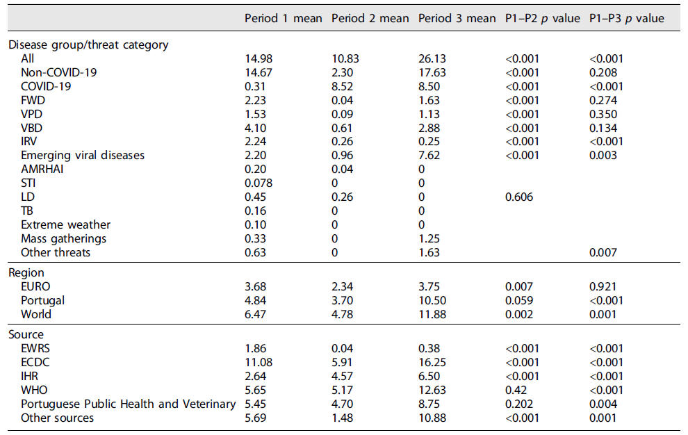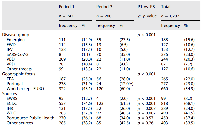 Table 1 Comparison of the average number of threats reported by month in different periods for a disease category, source, and geographical focus (n = 1,202), Portugal, January 2016-September 2022