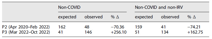 Although some COVID-19 restrictions could justify a reduction in reported threats for specific disease groups (e.g., IRV, vaccine-preventable diseases), we argue that it is unlikely that the dimension of the observed reduction in most other threats was entirely due to the absence of those threats. This is supported by our finding that observed non-COVID threats were still lower than expected using forecast methods considering trends and seasonality, even when modelling the forecast exclusively for non-COVID-non-IRV threats.