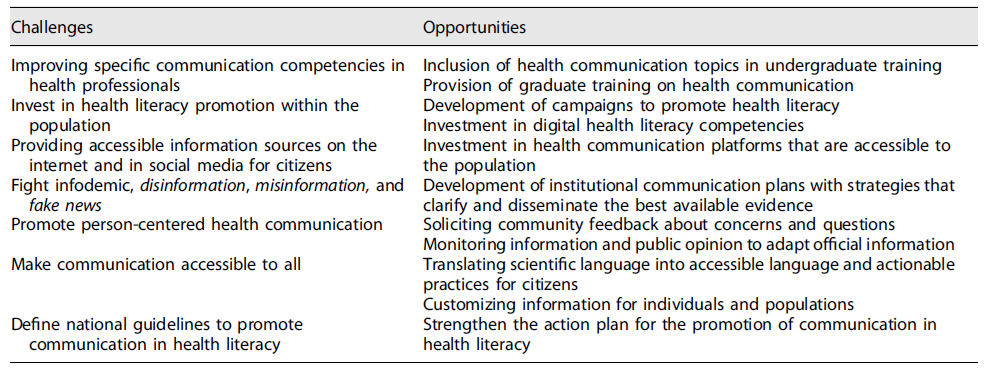 Therefore, the health sector needs to adapt to the new digital reality by equipping multidisciplinary teams with new competencies and strategies that not only consider the current situation but also incorporate monitoring and adaptation of conveyed information 21. This ensures equitable information transmission for everyone and leaves no one behind. Finally, the most challenging task is to achieve person-centered health communication by actively listening to individuals’ real needs and searching for effective solutions that empower both individuals and populations 17. Communication emerges as a central element in the dimensions of health literacy, playing a crucial role in translating knowledge into health-promoting behaviors and well-being. Table 1 provides a summary of these new challenges and points to some opportunities to improve communication in health literacy.