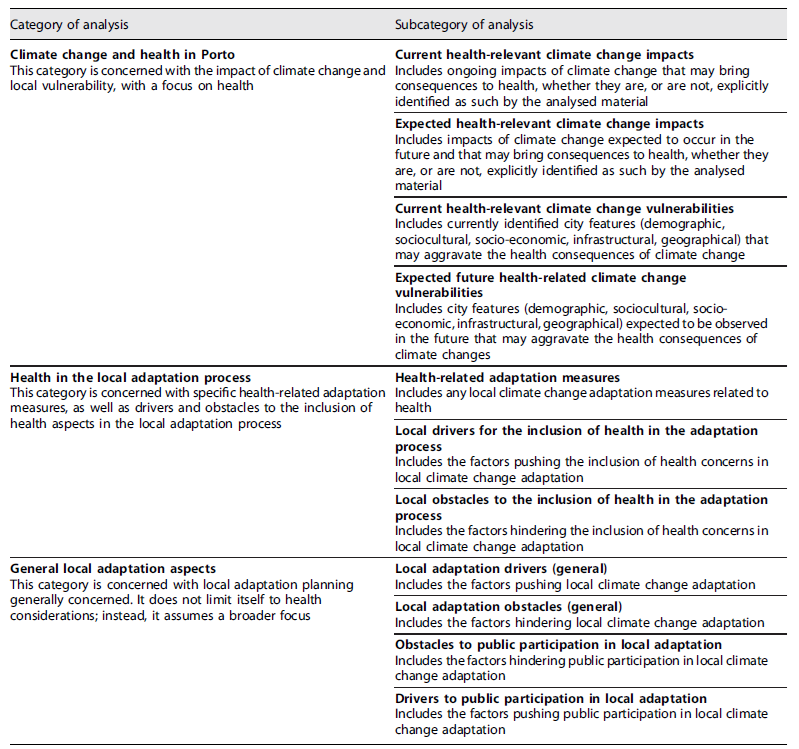 We analysed both the Municipal Climate Change Adaptation Strategy (EMAAC) 25 and the Metropolitan Plan of Adaptation to Climate Change, Metroclima 37, which is relevant because Porto is part of the PMA. These documents were selected for this study because, unlike sectorial plans, they focus on climate change adaptation in a holistic way and are key to all aspects of the local adaptation strategy for Porto and the PMA. We also conducted semi-structured interviews with key stakeholders to deepen our perspectives on the issue. The interview guide is supplied as online supplementary material (online suppl. file 1; for all online suppl. material, see https://doi.org/10.1159/000540747). Our purposeful sample included six key stakeholders, three men and three women, with ages between 46 and 60 years old at the time of the interviews, all of them selected as information-rich cases 38. We selected local stakeholders with considerable knowledge about local climate change adaptation but also with different professional roles and institutional affiliations, to ensure both richness of information and diversity of perspectives. All interviewees are (or were until recently) connected to institutions headquartered in Porto. The sample included two city planners, two academic researchers, one public health officer, and one politician. The small number of interviewees is justified both by our purpose of gathering information about the local adaptation process from a few information-rich key stakeholders as a way to supplement the analysis of official documents and by the low number of people working locally on the topic of our study. All interviews were conducted over the Zoom platform in March 2021, in Portuguese language, by the same author, and recorded for transcription. The duration of the interviews ranged from 49 min to 1 h and 24 min. For confidentiality and anonymity reasons, we will not match any interview content to professional or institutional roles or demographic data, although doing so could allow the reader to better frame the content. Both the documents and interviews were subjected to a qualitative content analysis 39 using NVivo software (Release 1.0). One author used a previously generated categorization matrix to analyse the materials with flexibility to create new analytical subcategories during the analytical process if needed, always within the bounds of the initial matrix. The result of this procedure was discussed with another author. The final analytical matrix is presented in Table 1.