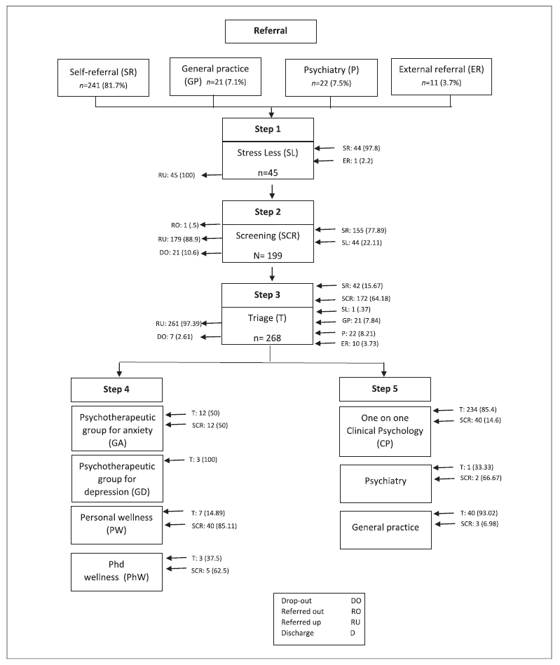 Figure 1 shows that people who sought clinical psychology appointments start their process via SR, referral from a medical appointment (GP or psychiatry P), or other services in the university or community (external referrals). At this stage, self-referred or externally referenced students go to StressLess (step 1) followed by screening (step 2), and subsequently, triage (step 3). Students referred by the medical appointments go directly to triage (step 3) because it is assumed that the clinician performed the triage. After triage, students can be referred to therapeutic or skills promotion groups (step 4) or to cognitive-behavioral individual psychotherapy (step 5). When self-referred or externally referred students reach step 5, they can also access psychiatry appointments if needed.