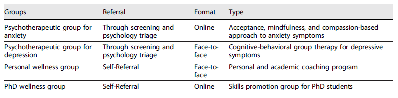Individuals with mild-to-moderate psychological disorders, at first and whenever possible, are referred to interventions of low-to-moderate intensity and are described in Table 1. Some of these interventions have psychotherapeutic goals and are only accessible through screening and triage, and others are available to all university students, aiming to promote the well-being and mental health of the community. Specific groups for the more prevalent difficulties were developed, and homogeneity of group members’ difficulties was privileged (e.g., separate groups for anxiety and depression although high comorbidity can be observed) to facilitate sharing-specific difficulties (e.g., social anxiety-related difficulties).