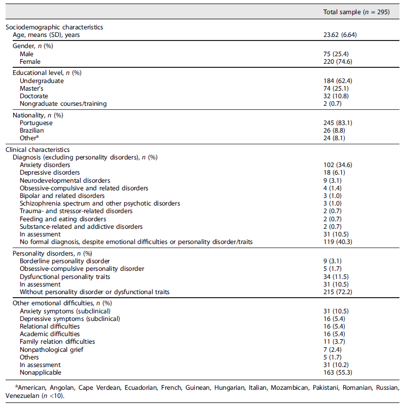 The sociodemographic and clinical characteristics of the total sample are presented in Table 2. The results showed that a total of 295 students sought psychological help, with a mean age of 24. Most students were female, undergraduate, and of Portuguese nationality. The clinical assessment established that the disorders with the highest prevalence were anxiety disorders (35%) and depressive disorders (6%). Regarding personality disorders, 12% showed dysfunctional personality traits, and 5% met the criteria for a specific personality disorder. Other emotional difficulties were found in 34% of the sample, such as subclinical anxiety and depressive symptoms and family relationships-related difficulties.