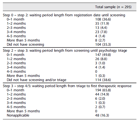 Statistical analyses were conducted using the Statistical Package for the Social Sciences (IBM SPSS, version 25.0). Descriptive statistics were performed to describe the sociodemographic and clinical characteristics of the sample, the flow of the stepped care approach, and patient waiting periods.