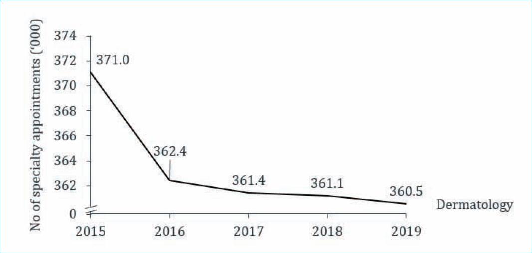 Figure 1 Evolution of production of specialties in dermatology in public health care (2015–2019, all diseases)18.