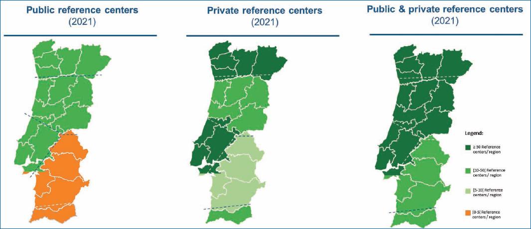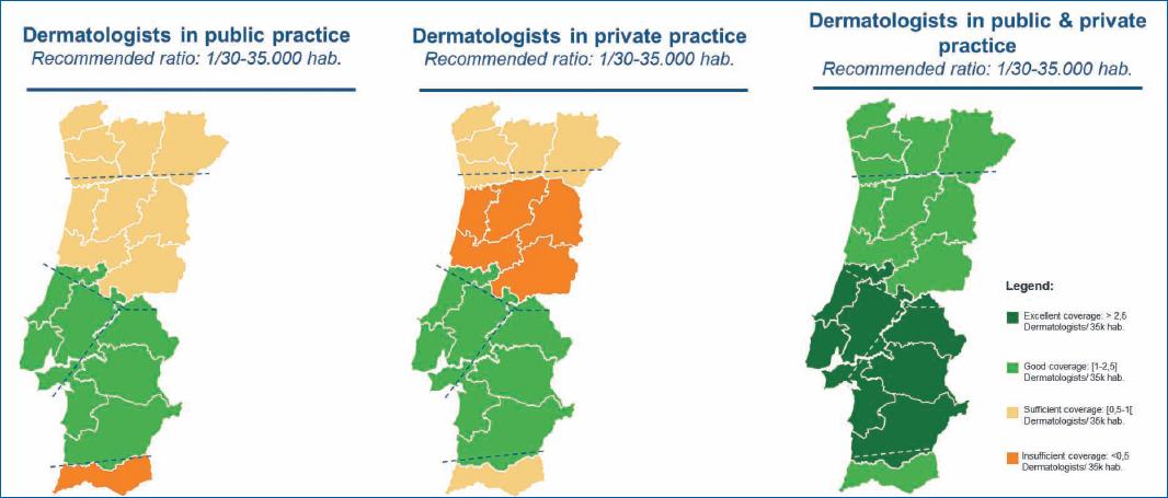 The territorial coverage of dermatology (institutions and specialists)–There are significant regional differences in the distribution of providers of dermatologic care, both in the SNS and private sectors. Private setting plays an essential role in complementing the SNS, namely mitigating the regional differences in coverage. Figures 2 and 3 18-20 illustrate the uneven territorial distribution in dermatology centers and specialists, respectively. When compared, the North and Center regions and the region of Lisbon have more resources in specialized care in dermatology than the southern regions. Reduced public coverage by centers specialized in dermatology was found in the Alentejo and the Algarve; some districts did not have public dermatology care services. Considering the territorial coverage of dermatologists, it is insufficient to meet the recommended ratio of 1/30,000-35,000 dermatologists for the population covered20.