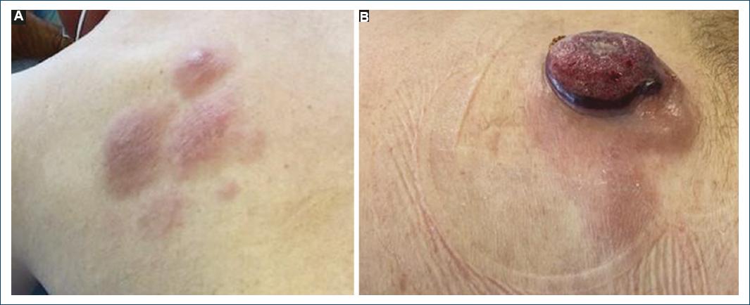 Figure 1 A: patient with a well-demarcated, erythematous, and scaly patch with two infiltrated plaques within it and B: an ulcerated and well-demarcated tumor on his left lower back.