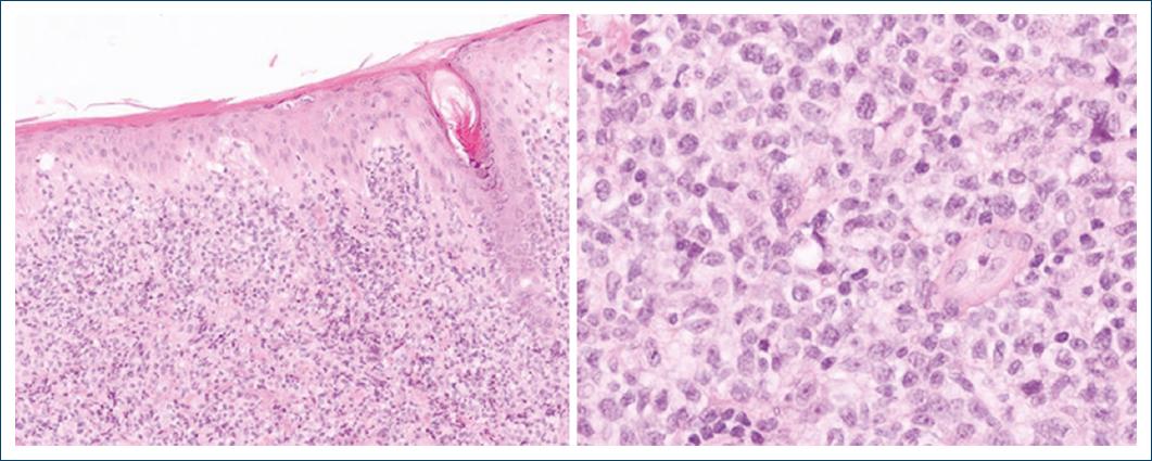 Figure 2 Infiltration of the dermis by atypical, intermediate size lymphocytes, with dispersed chromatin.