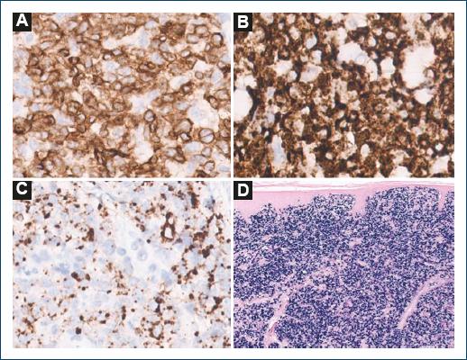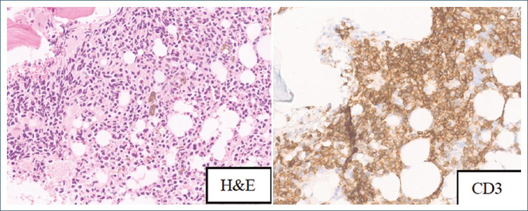The bone marrow trephine revealed a diffuse, mas- sive interstitial infiltration of medium-sized T-cell lym- phocytes, positive for CD3, CD2, CD45, CD56, and TCR ãä by flow cytometry, compatible with infiltration of the bone marrow by a ãä T-cell lymphoma, and identical to the previously described on the skin (Fig. 4). An identical clonal rearrangement of the T-cell receptor delta gene was detected both in the bone marrow and in the biopsy of the skin lesion.
