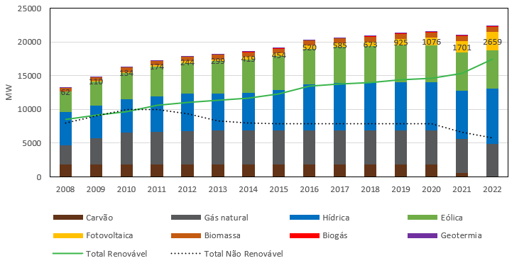 Fig. 1 Potência instalada nas centrais produtoras de energia elétrica em Portugal (excluindo cogeração, tipologias de cogeração e hídrica em bombagem)