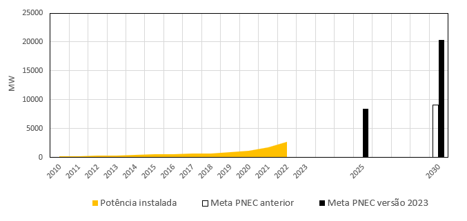 O segundo resulta de um “atraso” que o país apresenta em termos de capacidade solar instalada, significativamente inferior a outros países europeus em contextos climáticos menos propícios ao aproveitamento solar. Em Portugal, a trajetória de descarbonização do sistema elétrico tem sido alcançada maioritariamente por meio da produção hidroelétrica e eólica, que apresentavam, em 2022, respetivamente, uma capacidade instalada de 8,1 GW e 5,7 GW (fig. 1). Por sua vez, a potência instalada solar fotovoltaica foi de apenas 2,6 GW, dos quais 1,5 GW foram instalados após 2020. Apesar da localização geográfica privilegiada, Portugal ocupava, em 2022, apenas a 18ª posição em termos de capacidade solar instalada na UE-27 (EUROBSERV’ER, 2023). Neste sentido, não só persiste um vasto potencial de desenvolvimento ainda por explorar, como uma ambição de recuperar este atraso.