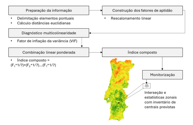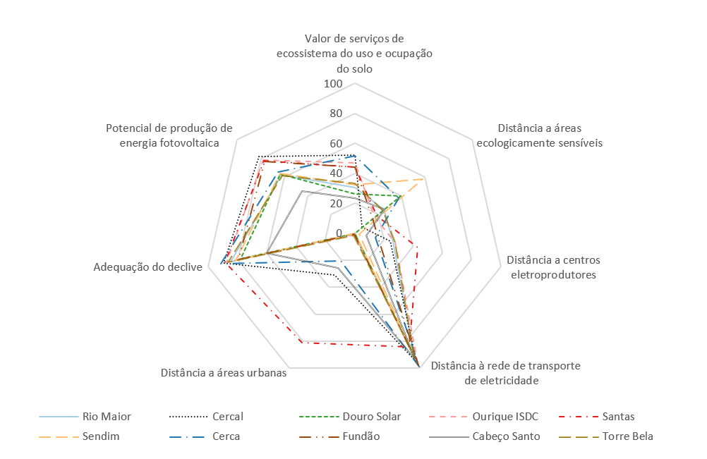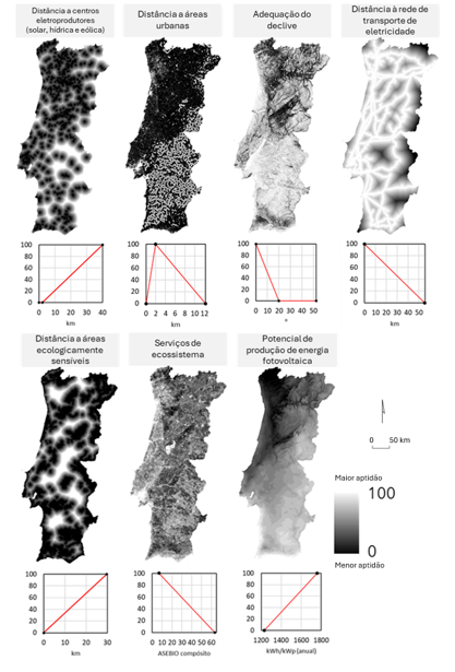 Estas variáveis foram transformadas em sete fatores de aptidão, ou seja, indicadores quantitativos (normalizados linearmente para a escala 0-100) que classificam as unidades de análise pela sua aptidão: (i) distância a centros eletroprodutores (solar, hídrica e eólica); (ii) distância a áreas urbanas; (iii) adequação do declive; (iv) distância à rede de transporte de eletricidade; (v) distância a áreas ecologicamente sensíveis; (vi) valor de serviços de ecossistema do uso e ocupação do solo; e (vii) potencial de produção de energia fotovoltaica.
