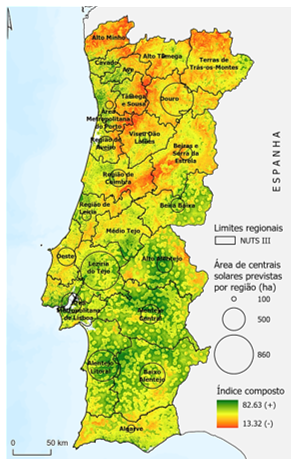 Num exercício exploratório das áreas com maior potencial de sustentabilidade (índice ≥70, correspondendo à metade superior do 10.º decil) e pelo menos 100ha contíguos identificaram-se cerca de 34 mil ha (0,38 % de Portugal continental). Se considerarmos uma estratégia mais descentralizada, com a promoção de centrais de menor dimensão, com o critério de 50ha contíguos, a área disponível aproxima-se dos 40 mil ha. Estes valores são à partida, suficientes para cobrir os projetos licenciados e em processo de licenciamento (cerca de 6800ha) de centrais solares fotovoltaicas com potência ≥ 1MW. Não obstante, tal extensão territorial revela-se insuficiente para responder às metas de 2030 unicamente pela produção centralizada, o que implica a necessidade de instalação de centros eletroprodutores em locais com tendência para conflitos com os princípios de sustentabilidade.