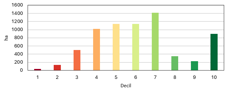 Neste contexto, observam-se já potenciais desconformidades entre o potencial avaliado pelo índice e a realidade, uma vez que a distribuição dos projetos planeados indica que uma parte significativa dos projetos se sobrepõe com baixos valores do índice (fig. 6). Por sua vez, verifica-se uma reduzida sobreposição dos projetos com territórios com o índice nos decis 8 e 9, pelo que se pode afirmar que existe potencialidade para explorar localizações mais sustentáveis. A análise da figura permite compreender que as regiões Centro e Norte serão as que terão maiores desafios na territorialização da energia solar de acordo com os parâmetros considerados, já que apresentam, em geral, menor aptidão.