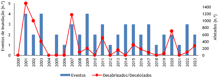 Fig. 2 Número de eventos de inundação fluvial e afetados registados nos municípios de Estrela e Lajeado, entre 2000 e 2023.