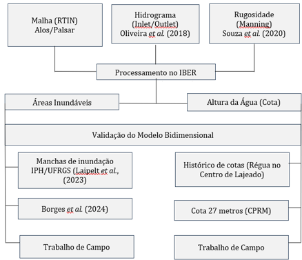Os procedimentos metodológicos utilizados neste trabalho podem organizar-se em três fases distintas (fig. 3): (i) preparação dos dados de entrada no modelo hidráulico, incluindo dados de elevação, hidrograma de cheia e rugosidade; (ii) processamento do modelo 2D no IBER; (iii) validação dos resultados das áreas inundáveis e das cotas de inundação, comparando com o modelo do Instituto de Pesquisas Hidráulicas da Universidade do Rio Grande do Sul (IPH/UFRGS).