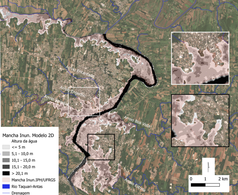 O modelo hidráulico 2D, gerado no IBER, possibilitou definir as áreas sujeitas à inundação nas áreas urbanas de Estrela e Lajeado, indicando uma altura máxima da água de 27,18 metros, valor obtido diretamente no processamento, sem a necessidade de calibração para se aproximar ao valor estabelecido pela CPRM (2021). Além das áreas sob influência direta do rio Taquari-Antas, é possível destacar porções onde as inundações ocorrem associadas ao Rio Forqueta e arroios Engenho, Encantado e Saraquá, na margem direita e arroios Boa Vista e Estrela na margem esquerda.