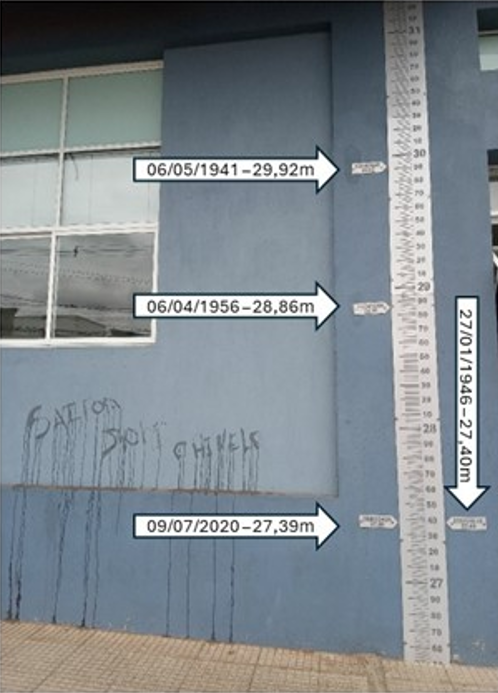 Os dados de campo também validam os resultados do modelo, assim como nossas descrições das fontes documentais. Relativamente aos dados hidrológicos, no modelo foram utilizados dados de vazão para um período de retorno de 100 anos. A altura da água considerada para definição de áreas suscetíveis junto a área urbana dos municípios é de 27 metros, conforme definição da CPRM. Porém já existem registo de cotas excepcionais com valores superiores aos 27 metros, o que sugere a necessidade de recalcular os períodos de retorno para séries mais longas e mais recentes.