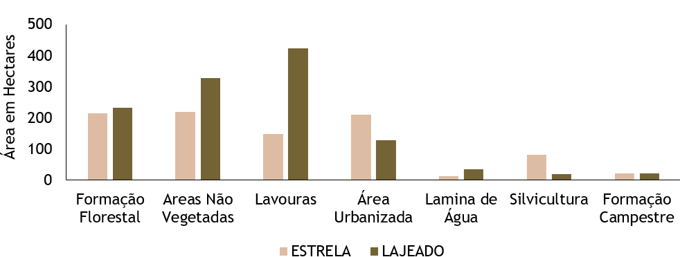 Fig. 6 Área inundada (ha) do modelo IBER 2D por tipo de uso e cobertura nos municípios de Estrela e Lajeado.