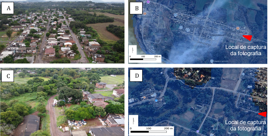 Fig. 8 Áreas suscetíveis a inundação no município de Estrela. Panorâmica das moradias no bairro Moinhos (A), imagem satélite indicando o local de captura da fotografia (B), panorâmica das moradias no bairro Imigrantes (C) e imagem satélite indicando o ponto de coleta da fotografia e um dos limites de inundação registados em campo (D).