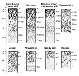 Soils: 1 - Light brown loess soils; 2 - Serozems; 3 - Reddish brown calcareous soils; 4 - Pararendzinas; 5 - Lithosols; 6 - Alluvial soils; 7 - Sandy soils; 8 - Regosols.