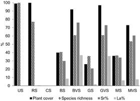 Figure 1 Plant cover and species richness under treatments. US: uncontaminated soil; RS: Recovered soil; CS: Contaminated soil; BS: Biopile soil; BVS: Biopile soil + vermicompost addition; GS: Gypsum amended soil; GSV: GS + vermicompost addition; MS: Marbel amended soil; MVS: MS + vermicompost addition. Sr: Spergularia rubra; La: Lamarckia aurea.