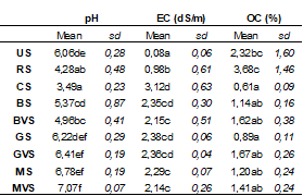 US: uncontaminated soil; RS: Recovered soil; CS: Contaminated soil; BS: Biopile soil; BVS: Biopile soil + vermicompost addition; GS: Gypsum amended soil; GSV: GS + vermicompost addition; MS: Marbel amended soil; MVS: MS + vermicompost addition. sd: standard deviation (n=6). Lowercase letters represent significant differences among soils (Kruskal-Wallis, P < 0.05).