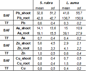 Spergularia rubra and Lamarckia aurea are two species frequently identified in the soils affected by the Aznalcóllar spill associated with areas where pollutant concentrations are high, with acid pH and high salinity. Thus, the capacity of these species as accumulators of pollutants was analyzed. The bioaccumulation factor (BAF) showed that both S. rubra and L. aurea are potent accumulators of Pb and As, both in the aerial part and, above all, in roots (Table 2). However, for these elements, L. aurea showed a higher BAF than S. rubra, specially in roots, although the abundance of the latter was higher in all treatments (Figure 1). This indicates that L. aurea is highly tolerant to great concentrations of pollutants, and that the conditions on the amended soils after the treatments has improved, allowing vegetation less tolerant to higher contamination levels to colonize them and to be present at higher rate. This is consistent with previous studies in the area, that indicated that L. aurea has a greater presence in the areas with higher levels of pollution (García-Carmona et al., 2019). For Zn, both species showed BAF values greater than unity, but to a lesser extent than for Pb and As, and none of them showed a significant accumulation capacity for Cu. In addition, the translocation factor (TF) was lower than one in all cases, indicating that there was no migration of these elements from roots to the aboveground parts of these species (Table 2). However, it was observed that TF in S. rubra was about twice as high as in L. aurea for all elements. This indicates that migration of elements to aerial part in S. rubra is higher than in L. aurea, where accumulation in roots is greater, which may allow this species to be present in soils with a higher degree of pollution.