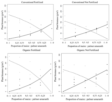 Figura 1 Biomasa de maíz y A. palmeri en las distintas series de reemplazo en campos convencionales (arriba) y ecológicos (abajo), con (izquierda) y sin (derecha) fertilizante modelizado según las ecuaciones de de Wit (1960).