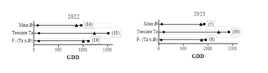 El 13 y el 10 de mayo de 2022 y 2023, respectivamente, se realizaron las siembras de los parentales. Los híbridos F1 se trasplantaron entre 10 y 15 días después cada año tras su identificación. El cultivo de las plantas se realizó en las condiciones descritas en el apartado anterior. El crecimiento vegetativo (VE) se midió una vez por semana durante 6 semanas después de la emergencia. Se analizó la altura, área del tallo entre las hojas 3 y 4, número de hojas y número de tallos secundarios. Durante la fase reproductiva se contabilizó el nº de días hasta la aparición del penacho (VT) y de estigmas (R1). La duración de VE, VT y R1 se expresó en unidades de tiempo térmico, calculando los grados-día de crecimiento (GDD) con límites de temperatura máxima (Tmáx) y mínima (Tmín) de 30°C y 10°C respectivamente, siguiendo la ecuación GDD30,10=[(Tmín + Tmáx)/2]-Tb, donde la temperatura base (Tb) fue de 10°C, acumulándose entre cada estado.