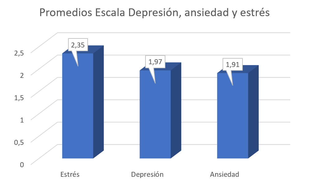 Los resultados muestran (Figura 1), respecto de los indicadores de salud mental (con un rango de 1 a 4), que existen niveles medio en estrés (M=2.35, DE= .78), además de bajos en depresión (M=1.97, DE= .70) y ansiedad (M= 1.91, DE= .78). Llama la atención que el nivel de ansiedad se muestra más bajo que el de estrés, relacionado posiblemente con un mayor nivel de carga de trabajo que con la incertidumbre por la pandemia de Covid-19.