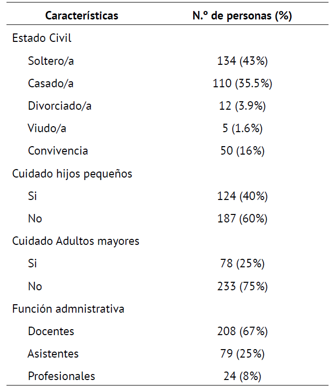 Los participantes fueron 311 funcionarios, docentes y no docentes, de 9 establecimientos públicos chilenos, de una comuna del sur de Chile; la muestra se integró por 246 mujeres (79%) y 65 hombres (21%), con edades comprendidas entre los 22 y los 67 años (M=38.4, DE=10.53). Dentro de las características sociodemográficas se señala que hay una mayoría de docentes y una minoría de profesionales, así mismo, según el estado civil la mayoría es soltero/a, seguido en segundo lugar de casado/a; una mayoría relativa señala no estar a cargo de niños/as pequeños/as, mientras que una mayoría más grande menciona que no cuida adultos mayores (ver Tabla 1).