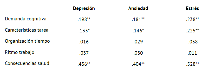 Respecto de las relaciones entre las variables ( Tabla 2), se puede señalar que se encontraron correlaciones positivas, significativas y medianamente altas entre la dimensión consecuencias para la salud de la escala de carga mental de trabajo y las dimensiones de estrés (r= .528, p< .01), depresión (r= .436, p< .01) y ansiedad (r= .404, p< .01). Cabe mencionar que, a nivel de salud mental, la dimensión de estrés es la que reporta mayores niveles de correlación con las dimensiones de carga mental de trabajo, generando una base hipotética de que los funcionarios educativos se encuentran con altos niveles de estrés por la sobrecarga laboral más que por situaciones contextuales de la pandemia, aunque no podría descartarse por completo esta última vinculación.