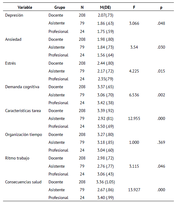 Finalmente, respecto de las características contractuales, se observan diferencias significativas entre funcionarios (docentes, profesionales y administrativos) en algunas dimensiones (Tabla 3). En forma específica, se observan mayores diferencias en la percepción de las características de la tarea, donde el grupo de profesionales y de docentes tienen mayor percepción de carga mental que los asistentes de la educación, lo mismo respecto de las consecuencias para la salud. Por otro lado, en las demandas cognitivas de la tarea se observan diferencias entre docentes y profesionales con los asistentes, pero con menor fuerza; igualmente se observan diferencias en el ritmo de trabajo, entre los mismos grupos, pero con una característica tendencial (cercano al .05).