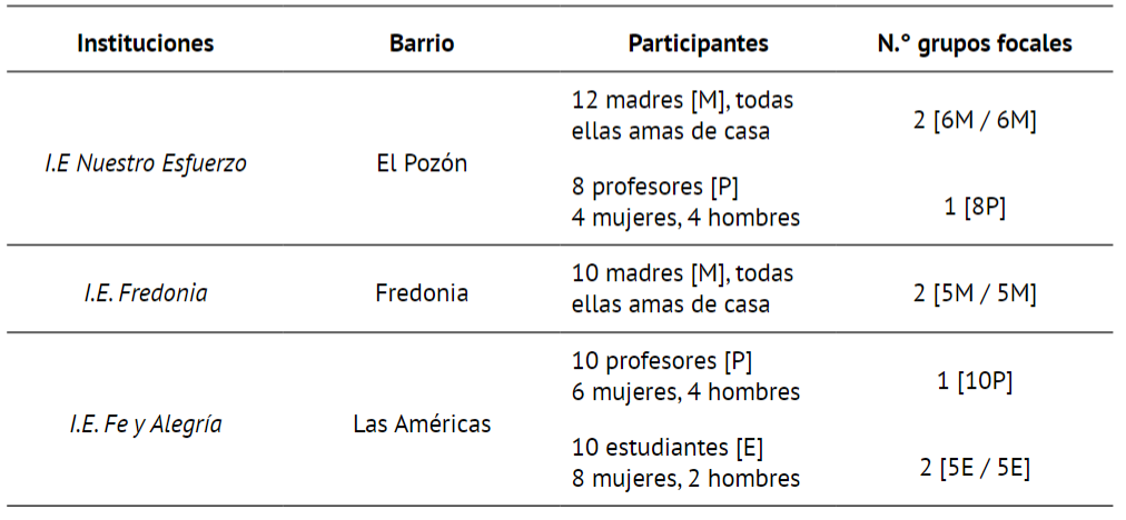 Los participantes y los colegios se seleccionaron mediante un muestreo por conveniencia, teniendo en cuenta que las instituciones educativas ya habían trabajado en el pasado con el equipo investigador. El grupo de investigación tomó la decisión de seleccionar al azar de la base de datos de los padres de familia (incluyendo mujeres y hombres). En un principio se esperaba conseguir veinte (20) individuos por cada institución participante y pertenecientes sus hijos a los grados educativos de cuarto, quinto y sexto. Fueron convocados 60 progenitores, padres y madres de familia, de los cuales solo asistieron veintidós (22) madres. Ningún padre respondió positivamente a la invitación, sin notificar los motivos de inasistencia. Cabe resaltar el apoyo de las directivas de los colegios participantes en la investigación para lograr realizar la base de datos de las madres, los docentes y los niños/as y así poder diseñar los grupos focales.