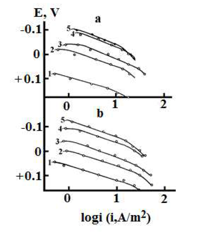 As it follows from Fig. 2, all the anodic polarization curves have sufficient lengths of the segments, with a Tafel slope coefficient of dE /dlog ia equal to 0.060 V. This reveals copper ionization in the form of singly charged ions.