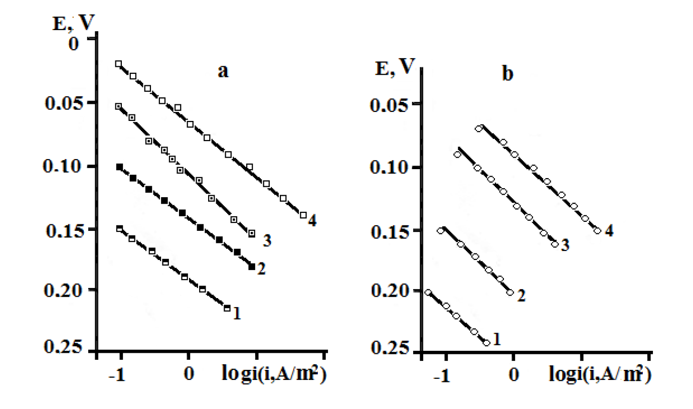 Figure 2. Stationary anodic polarization curves of copper coated with an oil film containing GGHQ, in aqueous solutions with an electrolyte composition of: (a) 0.1 M HCl + y M LiCl + (2.9 - y) M LiClO4 · y, mol/L: 1 - 0,1; 2 - 0.5, 3 - 1.5; 4 - 2.5; CGGHQ, wt.%: 40; and of (b) 60.