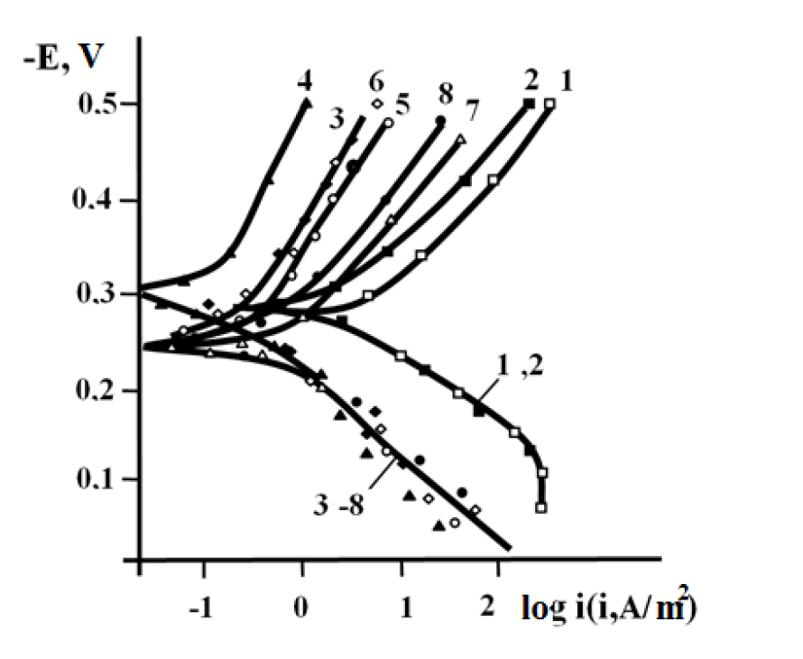 Figure 3. Potentiostatic polarization curves of iron in uninhibited (1, 2) and inhibited (1 g/L oxyethylated amines) 1 M HCl solutions (3 - 8). 1, 3, 5, 7 - no protective film; 2, 4, 6, 8 - the electrode is coated with an I-20A oil film of 20 μm in thickness. Number of oxyethyl groups in the inhibitor molecule:3, 4-2; 5, 6-5; and 7, 8-14.