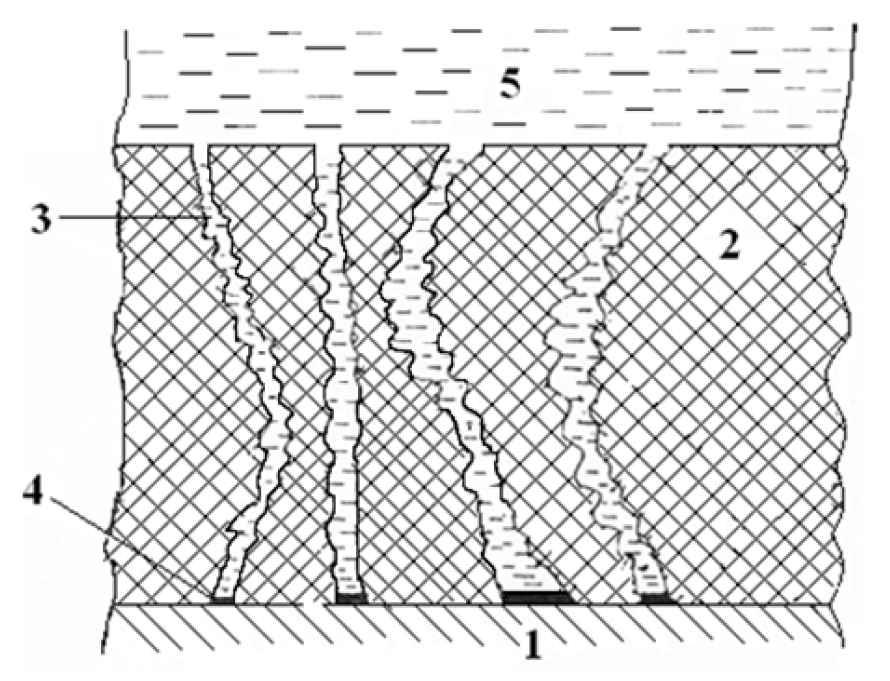 These experimental data can be consistently explained if one accepts discontinuities (capillaries) presence in hydrocarbon films. A schematic view of such capillaries (pores) is shown in Figure 4.