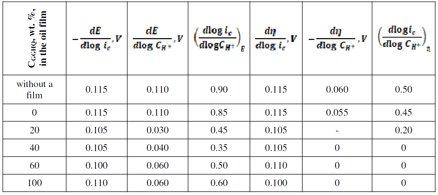 Table 4 Anodic dissolution kinetic parameters of copper coated with a hydrocarbon film based on I-20A oil, with 40 and 60 wt. % of GGHQ.