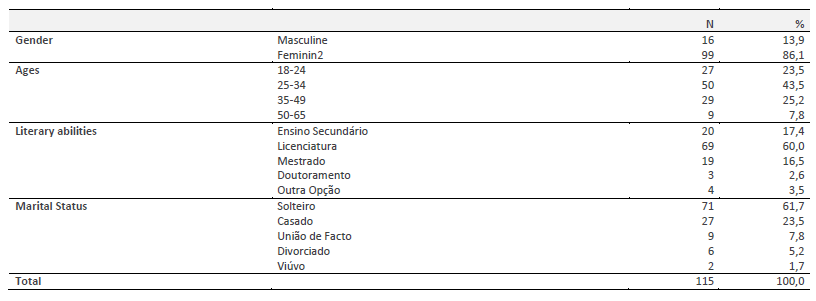 The study sample was composed of 115 employees from different companies located in the district of Viseu who, due to the COVID-19 pandemic, were forced to work from home. The respondents’ distribution according to their gender was heterogeneous since 86.1% were women and only 13.9% were men (table 1).