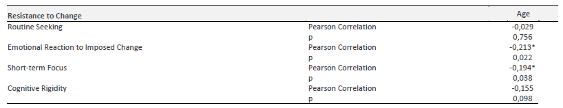 As for H3, which stresses the relationship between age and resistance to change, a negative correlation was found between the Emotional Reaction to Imposed Change subscale and age and the Short-term Focus subscale and age. That way, the older a person is, the lower their Emotional Reaction to Imposed Change and the lower their Short-term Focus. No statistically significant correlations were found in the Routine Seeking and Cognitive Rigidity subscales. Given the above, the research hypothesis is partially accepted (Table 4).