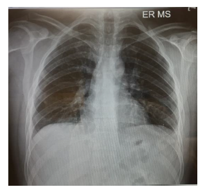 On initial examination in ED (Figure 1), pulse rate (PR) was 110/min, BP- 120/70 mmHg & Peripheral Oxygen Saturation (SPO2) was 89% on room air. An electrocardiogram (ECG) showed sinus tachycardia, and the Chest X-ray was normal. Figure 1 clearly indicates a small wedge-like triangular density in the left lower lobe of the right lung (Humpton’s hump).