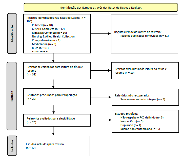 Após a pesquisa nas bases de dados foram obtidos um total de 100 artigos, após exportação para o software de gestão de seleção Rayyan, foram eliminados 61 duplicados. Seguidamente, através da leitura do título e resumo, de acordo com a aplicação dos critérios de inclusão pré-definidos, foram excluídos 10 artigos. Dos estudos procurados para recuperação não foi possível aceder ao texto integral de 3. Posteriormente a análise detalhada através da leitura do texto integral resultou na exclusão de artigos, emergindo 12 artigos incluídos na revisão.