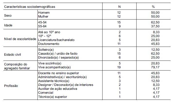 Como referido previamente, a amostra é constituída por 12 homens e 12 mulheres com idades compreendidas entre os 45 e os 64 anos, cuja caracterização sociodemográfica se sintetiza no quadro 1.