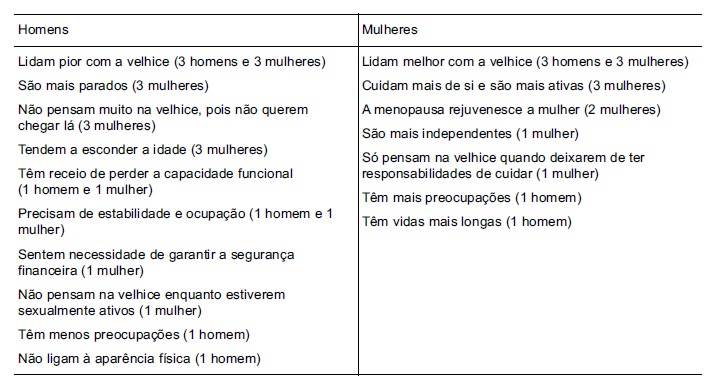 Como se pode verificar, existem algumas justificações que são referidas tanto por entrevistadas (mulheres) como por entrevistados (homens), enquanto algumas são mencionadas exclusivamente por entrevistadas e outras exclusivamente por entrevistados. A justificação mais mencionada tanto por homens entrevistados como por mulheres entrevistadas é a de que os homens lidam pior com a velhice, e as mulheres lidam melhor com a velhice. Por sua vez, as justificações mais mencionadas pelas mulheres entrevistadas são as seguintes: os homens são mais parados; os homens não pensam muito na velhice, pois não querem chegar lá; os homens tendem a esconder a idade; as mulheres cuidam mais de si e são mais ativas. Por fim, as justificações mencionadas pelos homens entrevistados têm apenas uma menção cada uma.