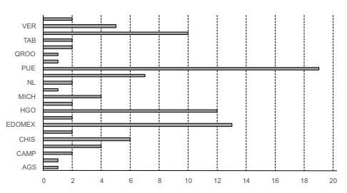 Leyenda: VER (Veracruz); TAB (Tabasco); QROO (Quintana Roo); PUE (Puebla); NL (Nuevo León); MICH (Michoacán); HGO (Hidalgo); EDOMEX (Estado de México); CHIS (Chiapas); CAMP (Campeche); AGS (Aguascalientes)