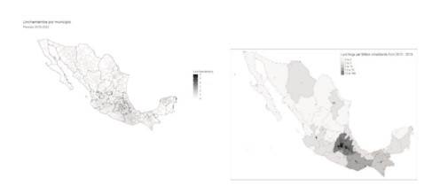 Por lo que se refiere a la distribución geográfica de los linchamientos en el país, hemos corroborado lo que varios autores han señalado previamente. Este es un problema geográficamente concentrado en cuatro entidades de la república mexicana: Puebla, Estado de México, Hidalgo y Tlaxcala, seguidas por los estados de Oaxaca y Chiapas (ver figura 3). En la figura 4 se puede apreciar un mapa con la distribución espacial de los casos recopilados durante nuestra investigación y se compara con el elaborado por Nussio y Clayton (2022). Como se puede observar, sus similitudes son notorias, lo que no solo confirma lo que otras y otros autores ya han destacado en cuanto a los estados con mayor incidencia de linchamientos, sino quizás, también, a que se trata de entidades con sendas “zonas marrones” o con problemas de legitimidad del Estado. (O’Donnell, 1993; Levi, 1997; Nivette, 2014; Nussio y Clayton, 2022) (ver figura 5). Otras explicaciones serían su deficiente o nulo cumplimiento de la función de gestionar la solución del conflicto penal a través de sus instituciones (Bernal Sánchez y Galeas Lescano, 2021).