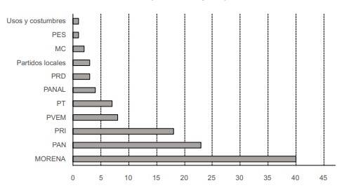 Legenda: PES (Partido Encuentro Social); MC (Movimiento Ciudadano); PRD (Partido de la Revolución Democrática); PANAL (Partido Nueva Alianza); PT (Partido del Trabajo); PVEM (Partido Verde Ecologista de México); PRI (Partido Revolucionario Institucional); PAN (Partido Acción Nacional); MORENA (Movimiento de Regeneración Nacional)