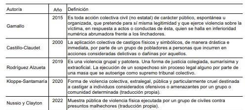 De acuerdo con Nussio y Clayton (2022: 5), cuya definición adoptamos en este trabajo por su carácter denotativo, para hablar de un linchamiento se requiere reunir cuatro criterios: (a) un acto de violencia física; (b) que al acto sea perpetrado por un grupo de civiles; (c) que los perpetradores actúen contra unos presuntos malhechores; y (d) que el acto incluya una demostración pública.